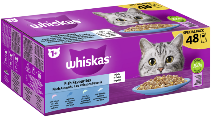 WHISKAS Portionsbeutel Multipack Special Pack 1+ Fisch Auswahl in Gelee mit Lachs, mit Thunfisch, mit Weissfisch, mit Kabeljaul 48 x 85gHochwertiges Katzenfutter in Gelee für Katzen ab 1 Jahr. Verwöhne deinen Liebling mit köstlichem Nassfutter mit Thunfisch und Lachs in der Großpackung. Bereite deiner Katze eine Freude! Speziell zubereitet, um das natürlich Gute und Köstliche der hochwertigen Zutaten zu bewahren. Mit unseren Lieblingsmahlzeiten eilt deine Katze schneller als je zuvor zum Napf! Vom verspielten Kätzchen bis zur wunderbar älteren Katze enthalten unsere schmackhaften Rezepturen alles, was deine Katze für ihr Alter braucht. Zubereitet für zufriedenes Schurren...während der Mahlzeiten und darüber hinaus.Als Katzenliebhaber wissen wir, dass Schnurren das schönste Geräusch ist, das man hören kann. Deshalb kreieren wir mit großer Leidenschaft köstliche Mahlzeiten, die Katzen auf der ganzen Welt dazu bringen, mit schnurrender Begeisterung zu ihren Näpfen zu eilen. Jedes Gericht wird mit Liebe und Sorgfalt zubereitet und ist ernährungsphysiologisch ausgewogen, um dabei zu helfen, dass deine Katze alles hat, was sie braucht, um bei den Mahlzeiten zu schnurren – und nicht nur dann. Jede köstliche Rezeptur enthält 100% hochwertige Zutaten und deckt alle täglichen Bedürfnisse deiner 1+ Katze. Mit hochwertigem Protein zur Unterstützung starker Muskeln. Hergestellt mit Vitamin C zur Unterstützung der natürlichen Abwehrkräfte. Enthält Zink, unterstützt eine gesunde Haut & ein gesundes Fell. Wir sind bestrebt, unsere Umweltauswirkungen zu verringern. Der Fisch in unseren Rezepten stammt aus nachhaltiger Produktion.Fütterungsempfehlung:1 Portionsbeutel lässt sich durch 16 g WHISKAS® Trockennahrung ersetzen. Berücksichtigen Sie die Kalorien, die von Snacks stammen. Passen Sie die Fütterungsmenge den Bedürfnissen Ihrer Katze an. Wie Besuchen Sie unsere Website. Stellen Sie frisches Trinkwasser bereit. Bitte bei Zimmertemperatur servieren. Bitte beachten Sie die Fütterungstabelle auf der Verpackung für eine individuelle Anpassung für Ihr Tier.Zusammensetzung:Fleisch und tierische Nebenerzeugnisse (33%), Fisch und Fischnebenerzeugnisse (u.a. 4% Lachs im Häppchen*), Getreide, Mineralstoffe, pflanzliche Nebenerzeugnisse, Zucker. *Häppchen machen 40% des Produkts aus. # mit Thunfisch - Zusammensetzung: Fleisch und tierische Nebenerzeugnisse (33%), Fisch und Fischnebenerzeugnisse (u.a. 4% Thunfisch im Häppchen*), Getreide, Mineralstoffe, pflanzliche Nebenerzeugnisse, Zucker. *Häppchen machen 40% des Produkts aus. # mit Weissfisch - Zusammensetzung: Fleisch und tierische Nebenerzeugnisse (33%), Fisch und Fischnebenerzeugnisse (u.a. 4% Weissfisch im Häppchen*), Getreide, Mineralstoffe, pflanzliche Nebenerzeugnisse, Zucker. *Häppchen machen 40% des Produkts aus. # mit Kabeljau - Zusammensetzung: Fleisch und tierische Nebenerzeugnisse (33%), Fisch und Fischnebenerzeugnisse (u.a. 4% Kabeljau im Häppchen*), Getreide, Mineralstoffe, pflanzliche Nebenerzeugnisse, Zucker. *Häppchen machen 40% des Produkts aus.Analytische Bestandteile:Protein: 7.8; Fettgehalt: 4.0; anorganischer Stoff: 1.6; Rohfaser: 0.25; Feuchtigkeit: 84.5. Brennwert: 62 kcal/85 g.Zusatzstoffe:Vitamin C: 702 mg, Vitamin D3: 200 IE(Vitamin D3 in den Lachs- und Thunfischvarietäten nicht zugesetzt), Taurin: 620 mg, Kupfer (Kupfer(II)-sulfat-Pentahydrat): 1.2 mg, Jod (Calciumjodat wasserfrei): 0.22 mg, Eisen (Eisen-(II)-sulfat-Monohydrat): 11.2 mg, Mangan (Mangan(II)-sulfat, Monohydrat): 2.2 mg, Zink (Zinksulfat Monohydrat): 16.2 mg / Technologische Zusatzstoffe: Cassia-Gum: 2148 mg / Sensorische Zusatzstoffe: Aromen.